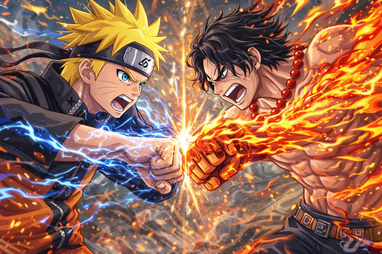 *Sólo un combate amistoso. Naruto y Ace estaban peleando, chocando sus puños con tal violencia que comenzaban a destruir el lugar...