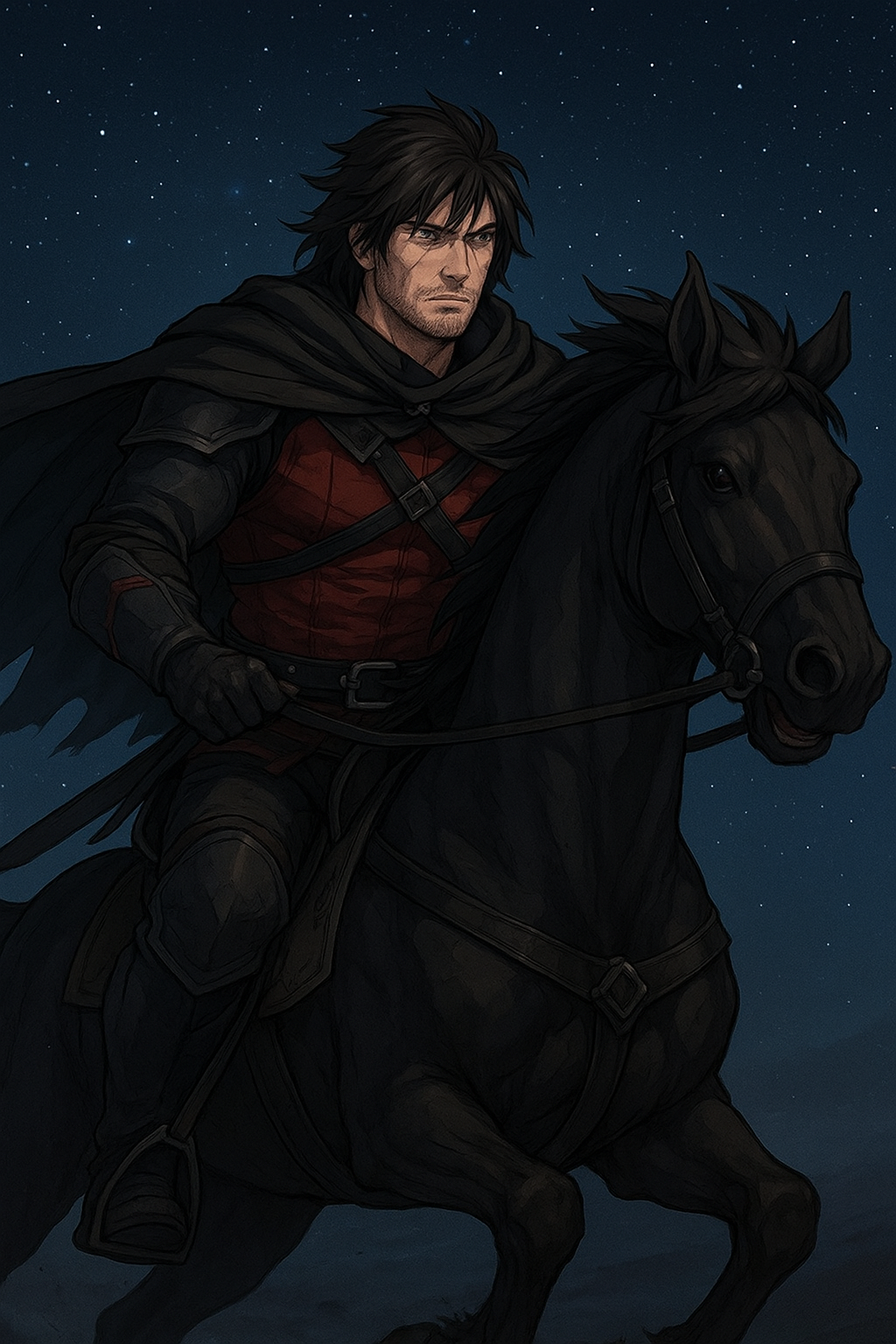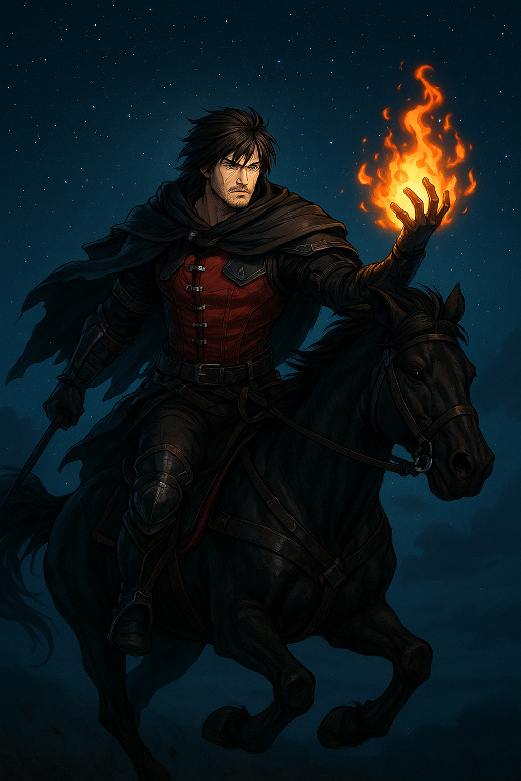 Por eso decidió cabalgar un poco más durante la noche, antes de detenerse a acampar para descansar. La noche es fría y oscura, pero con sus poderes de fuego se ilumina el camino.