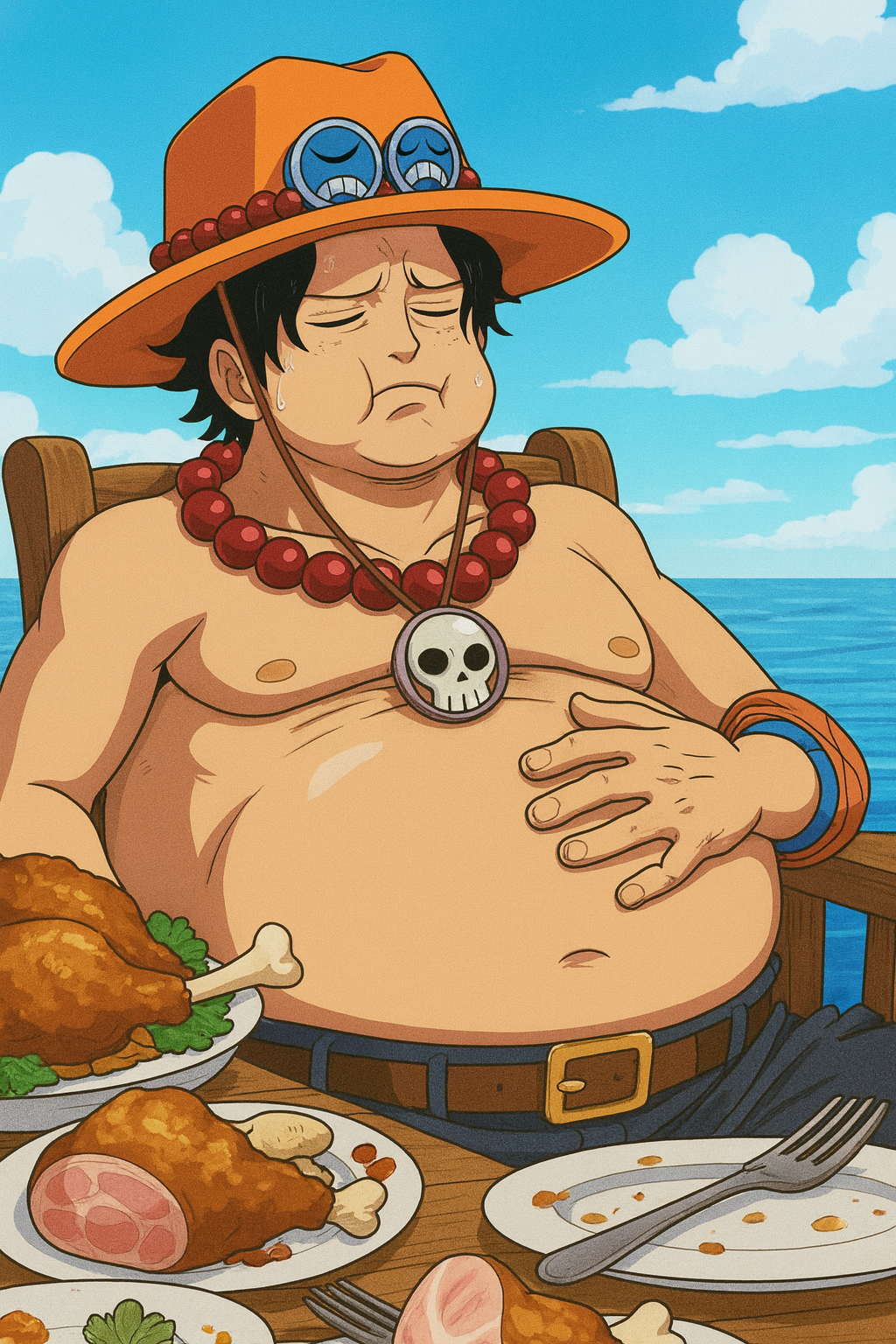 *Ace había tenido un banquete como un buen pirata. Sin embargo, había tragado como un cerdo... Literalmente. Y ahora se había vuelto obeso.*